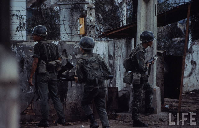 Những người lính VNCH đang dùng thang leo lên 1 building đọ súng với quân VC cố thủ bên trong.