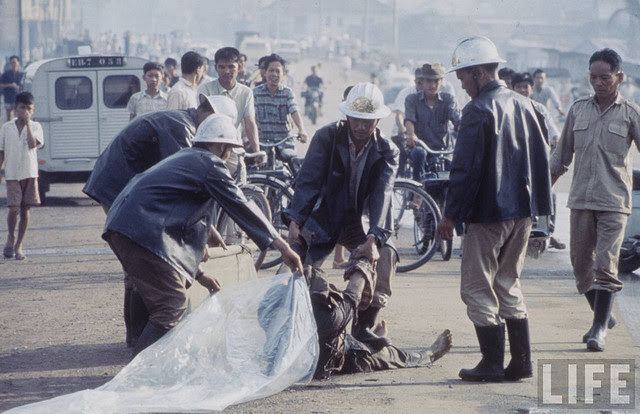 Lính cứu hỏa dọn dẹp xác chết VC tháo chạy bỏ lại :
