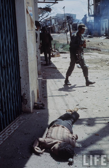 Xác 1 tên VC bị bắn trên mái nhà đang được lính Biệt động quân đưa xuống đất