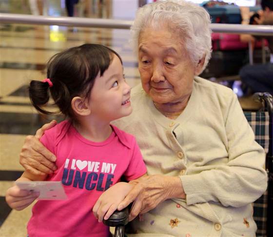 Em vừa nói vừa cầm tay kéo bà nội đi, bà cười: