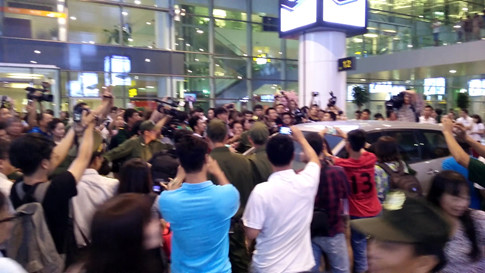 Một cán bộ an ninh sân bay phải làm... lá chắn cho Hoàng Xuân Vinh khi tiến ra ngoài cửa. Vừa đi, anh cán bộ an ninh vừa hô: Anh Vinh mệt quá rồi, yêu cầu bà con đứng dẹp để anh còn về nghỉ ngơi.