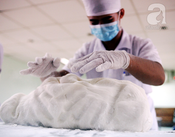 Đối với công đoạn sản xuất bánh nướng, cụ thể là bánh nướng thập cẩm thì lượng vỏ bánh chiếm khoảng 20%, 80% còn lại là nhân bánh. Những công nhân lành nghề đang thực hiện công đoạn lăn bột để tạo hình giúp lượng bột nếp này ôm trọn nhân bánh.