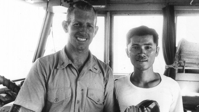 Đó là ông Steve Ulmer- từng là sĩ quan chỉ huy tàu tuần tiễu của Hoa Kỳ Point League; và ông Tùng Trần- từng là sĩ quan liên lạc của Hải Quân Việt Nam Cộng Hoà.