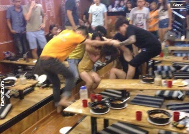 Một độc giả có nickname Dung Nguyen Dang cho biết, hai cô gái này xích mích vì lườm "đểu" nhau trong quán, cô gái mặc đồ đen đã đứng dậy ném cốc bia trước, sau đó cô áo vàng cùng người nhà lao vào đánh lại cô gái vừa ném, cuộc đụng độ trở nên phức tạp hơn khi cả hai bên gọi người nhà đến "giải quyết".
