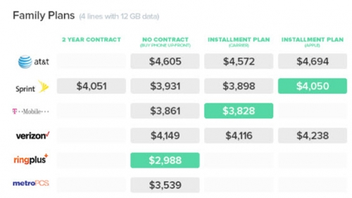 Đối với gói gia đình, kết quả là khác nhau. Khách hàng mua smartphone từ T-Mobile và sử dụng chương trình trả góp sẽ ngốn khoảng 3.828 USD/2 năm/4 người, với 12 GB data/tháng. Nếu khách hàng muốn có hợp đồng trả góp, nhưng muốn mua iPhone 7, nếu mua từ Sprint thì số tiền sẽ là 4.050 USD/2 năm.