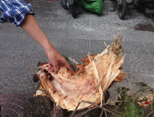 Quan sát tại hiện trường, phần bị gãy là một nhánh lớn của cây me tây, có đường kính hơn 20 cm, đang còn xanh tốt nhưng bên trong có dấu hiệu mục ruỗng.