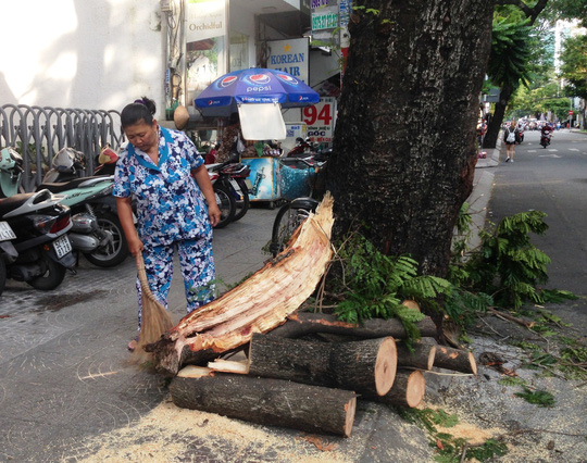 Sau khi xảy ra sự cố trên, các nhân viên Công ty TNHH MTV Công viên Cây xanh TP HCM đến cưa ngắn nhánh cây gãy và thu dọn vào lề đường.