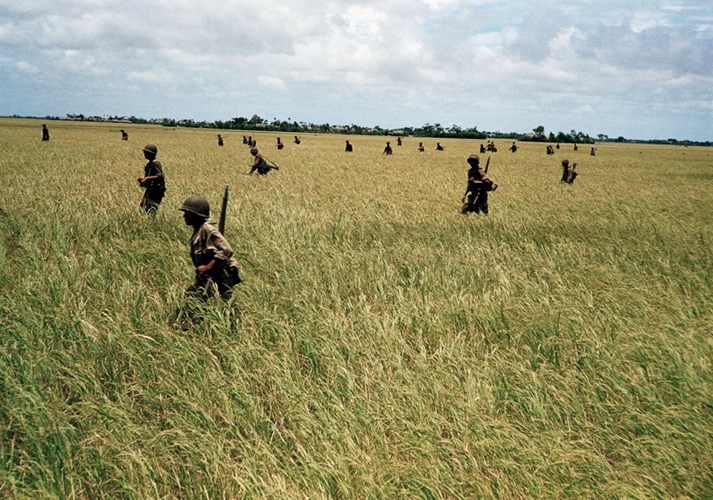 Binh sĩ người Việt trong quân đội Pháp tiến qua một đồng lúa giữa Nam Định và Thái Bình.
