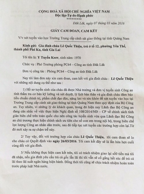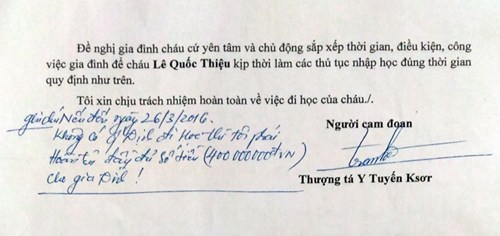 Các "khổ chủ" nôn nóng tìm gặp thì được ông Y Tuyến viết giấy cam kết đại ý như sau: Hồ sơ tuyển sinh của các cháu đã được nhà trường và đơn vị tuyển sinh thẩm tra, xét duyệt.
