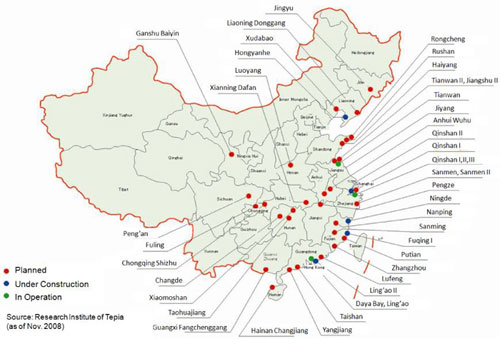 Kế hoạch xây dựng nhà máy điện hạt nhân của Trung Quốc, nhà máy đang hoạt động (màu xanh lá cây), đang xây dựng (xanh lam) và trong kế hoạch (đỏ). Nguồn: world-nuclear.org.