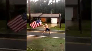 Lane Pittman cởi trần, cầm một lá cờ Mỹ và đứng giữa con đường ở thành phố Jacksonville, Florida, bất chấp mưa lớn và gió quật mạnh. Anh chàng liên tục quay đầu tóc dài của mình theo một bài hát của nhóm nhạc rock nổi tiếng Slayer, Huffington Post cho hay.