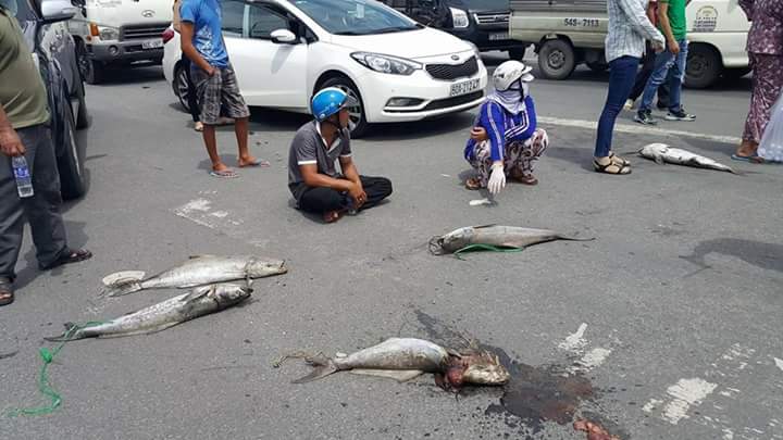 Mới đây,xảy ra hiện tượng cá chết hàng loạt tại Vũng Tàu.Quá phẫn nộ,bà con ngư dân mang số lượng cá lớn đi biểu tình.Cá được trải đầy khắp đường gây ùn tắc giao thông nghiêm trọng.
