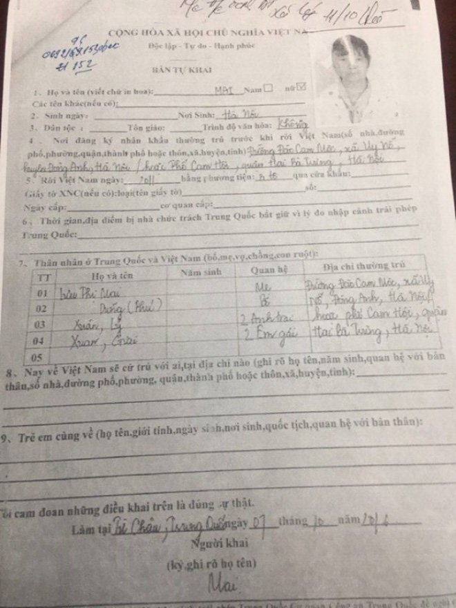 Lời khai mới nhất cháu bé tên là Triệu Mai, 17 tuổi chứ không phải 12 tuổi như thông tin ban đầu. “Ở Hà Giang không có huyện Long Hà như thông tin trong lời khai của cháu bé. Chúng tôi cũng cho rà soát lại các vụ việc nhưng chưa phát hiện có trường hợp nào như vậy vì rất khó ở chỗ, cô bé ấy không nói được tiếng Việt, không nhớ địa chỉ. Nếu có địa chỉ thì chúng tôi chỉ cần nửa ngày để tìm ra. Hiện Công an Hà Giang vẫn phải chờ thông tin chính xác rồi điều tra tiếp”-đại tá Hầu A Lý cho hay.