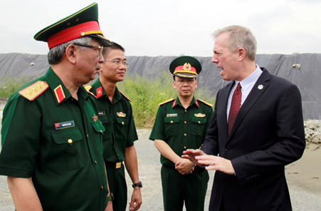 Đại Sứ Mỹ Ted Osius đang nói chuyện với thứ trưởng Bộ Quốc Phòng Nguyễn Chí Vịnh và hai tướng Việt Cộng tại phi trường Đà Nẵng, nơi mà bùn đất nhiễm dioxin được phủ kín ở đằng sau ngày thứ Ba. (TP Online)