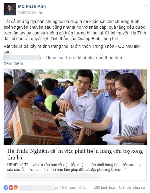 Trên trang facebook cá nhân, MC Phan Anh cho biết toàn bộ những địa điểm mà đoàn cứu trợ anh tham gia đều không có hiện tượng bị thu lại. Phan Anh khẳng định chính quyền Hà Tĩnh đã có những chỉ đạo rất quyết liệt vì vậy anh rất tiếc khi biết thông tin người dân thôn Trung Thôn bị thu lại tiền cứu trợ.
