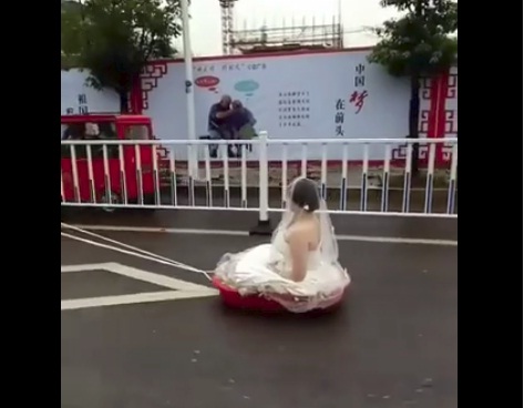 Quan sát kĩ các khuôn hình trong đoạn video clip, có thể thấy màn "lôi nàng về dinh" này diễn ra trên một con phố tại Trung Quốc. Theo đó, chú rể đi xe tay ga màu trắng kéo theo một chiếc xe lắc dành cho trẻ em màu đỏ để cô dâu ngồi lên ở phía sau.