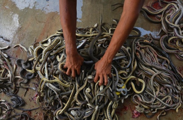Rắn bị lột da xong sẽ bị bỏ đói trong vòng 2-3 ngày cho đến chết. Thịt chúng được vệ sinh cẩn thận, đóng hộp và đem bán.