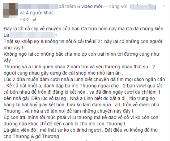 "Thật sự khiếp sợ và không tin nổi ở cái thế kỉ 21 này lại có những con người như vậy! Không ngờ lại có những bậc cha mẹ ép con trai mình tới đường cùng như vậy. Thương và anh Linh quen nhau 2 năm trời và yêu thương nhau thật sự. 2 người cùng nhau gây dựng được cái shop nho nhỏ làm ăn.