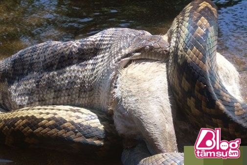 Con mồi đáng thương bắt đầu rơi vào vòng siết chặt của chú trăn khổng lồ này. Sau khi siết chặt đứt xương và làm con mồi ngạt thở, loài trăn mới bắt đầu xơi tái nó.