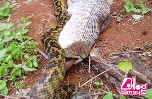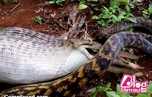 Con chuột túi trông có vẻ to hơn con trăn nhưng nó đã bị con trăn này nuốt trọn.Chứng kiến cảnh tượng con trăn mở miệng to hết cỡ nuốt trọn con mồi khiến ai cũng phải rùng mình sợ hãi.Cận cảnh con trăn quấn chặt con mồi và nuốt trọn vào bụng.