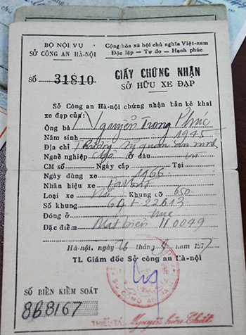 Giấy chứng nhận sở hữu xe đạp của ông Nguyễn Trọng Phúc, nguyên Viện trưởng Lịch sử Đảng. Những chiếc xe đạp như Peugeot, Aviac... có giá trị bằng cả cây vàng nên có giấy chứng nhận sở hữu như ôtô, xe máy hiện nay. Ảnh: Hoàng Phương.