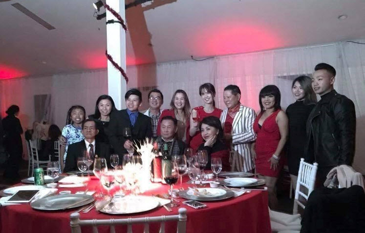 Chiều tối qua, dân mạng sôi sục vì ảnh Ngọc Trinh ra mắt gia đình và bạn bè của tỷ phú Hoàng Kiều trong bữa tiệc ở California, Mỹ với khách mời khoảng 20 bàn. Diện đồ xuyệt tông màu đỏ, Ngọc Trinh đứng ngay sát bên tỷ phú Hoàng Kiều, nắm tay bạn trai, nâng ly rượu và nở nụ cười rạng rỡ.