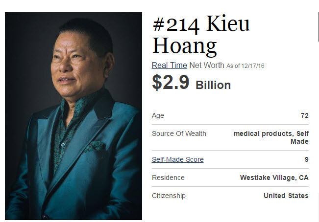 Tính đến ngày 17.12.2016, tài sản của tỷ phú Hoàng Kiều là 2,9 tỉ USD tính theo tạp chí Forbes.