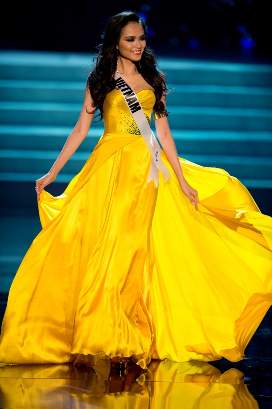 Diễm Hương với chiếc váy vàng rực rỡ tại chung kết Hoa hậu Hoàn vũ 2012.