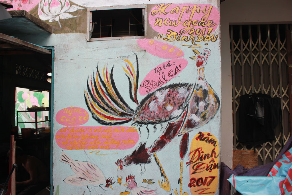 Chỉ còn hơn 2 tuần nữa là đến tết, không khí xuân đang về trên khắp trong nhà, ngoài ngõ. Và hơn hết, người ta càng cảm nhận một cái Tết rõ ràng hơn khi bước chân đến con hẻm bình dị, mộc mạc nhưng tràn ngập sắc xuân này. Ông Minh chỉ tay vào bức vẽ hình gà trên tường nhà, nói: “Tôi vẽ bức này cũng mong cho mọi người năm mới có nhiều sức khỏe, hạnh phúc. Như kiểu năm Dậu thì gà cũng có thể là soái ca”.