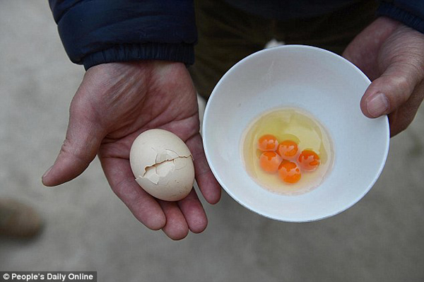 Cô Tao ở tỉnh Hà Bắc, Trung Quốc lấy một quả trứng để chuẩn bị cho bữa ăn nhẹ ngày 23 tháng 1 thì quả trứng đập ra có tới 5 lòng đỏ.