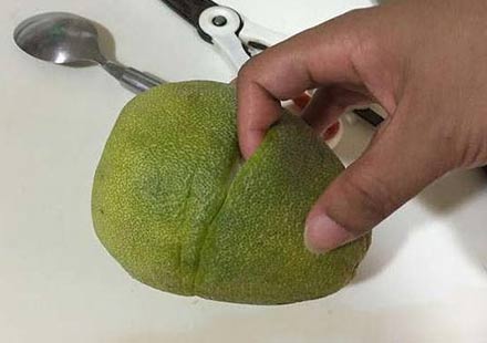 Bước 4: Dùng hai ngón tay cái và dùng sức ấn mạnh để tách đôi quả bưởi ra mà không bị nát. Khi tách nhớ chú chú giữ quả bưởi đứng đúng tư thế ban đầu.