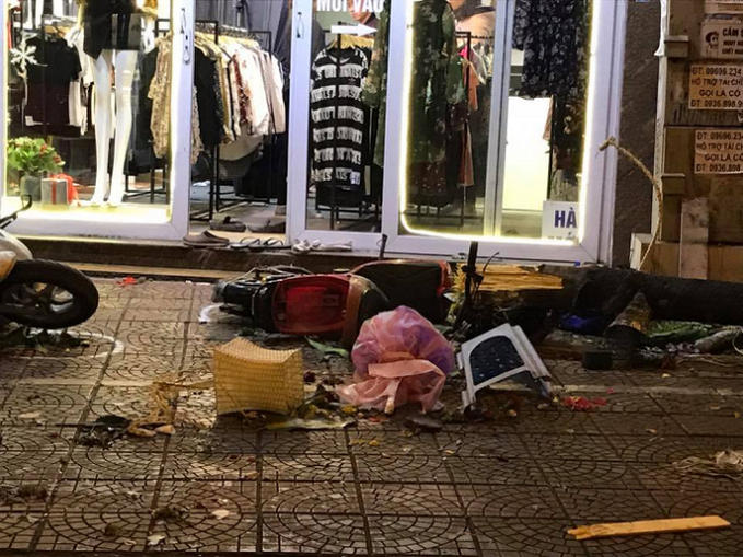 Theo ghi nhận tại hiện trường, hàng loạt chiếc xe máy đổ rạp, nằm chỏng chơ trên vỉa vè. Vụ tai nạn khiến một cây xanh gãy đôi, bật gốc. Đoạn vỉa hè từ số nhà 120-122 bị cày nát.