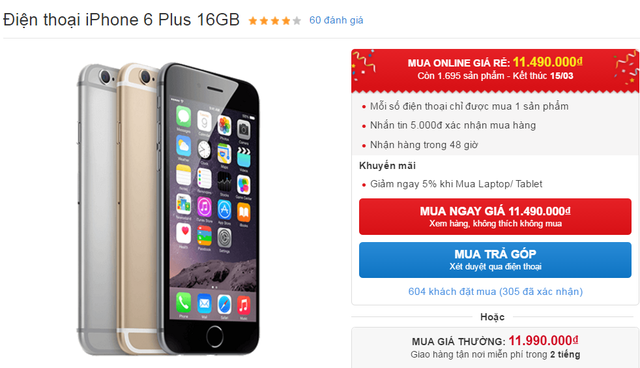 Thế nhưng nhiều nhà bán lẻ trong nước lại đang bán iPhone 6 Plus chính hãng với giá 11,49 triệu đồng với hình thức mua hàng online, qua đó rẻ hơn 500,000 đồng nếu mua iPhone 6 với giá 11,99 triệu đồng.