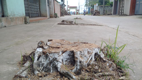Chính quyền xã đã cho chặt hạ hơn 70 cây xanh dọc tuyến đường liên thôn. Theo những người dân, chính quyền xã đã không họp bàn lấy ý kiến, chỉ yêu cầu ký cam kết chấp nhận cưỡng chế chặt cây xanh trồng trong phần đất công.