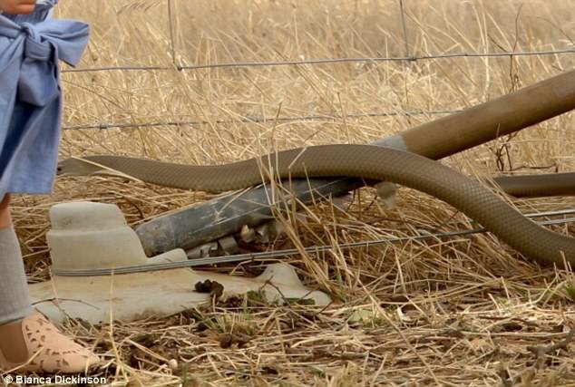 Tuy nhiên, chị Bianca Dickinson, bà mẹ của bé gái 2 tuổi người Úc, Molly đã phát hiện ra một con rắn nâu khổng lồ đang bò đằng sau chân con gái mình.