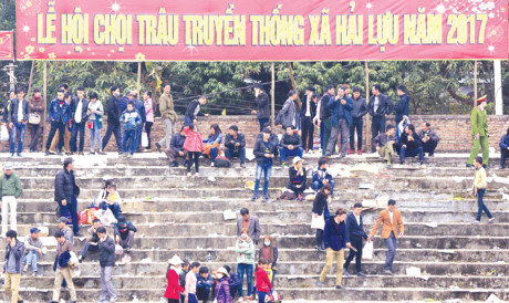 Du khách xả rác trên khán đài sau khi xem chọi trâu ở Vĩnh Phúc. Ảnh: Hồng Vĩnh.