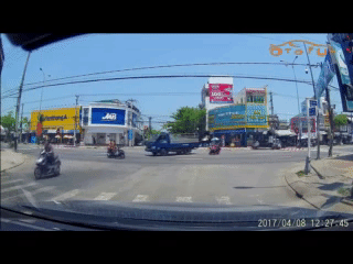 Cụ thể trong đoạn camera hành trình được ghi lại tại ngã tư phố, một chiếc xe máy đã cố tình nhấn ga để vượt mặt chiếc xe tải đang chạy cùng chiều. Và hành động liều lĩnh này đã trở thành nguyên nhân gây nên một vụ va chạm rất mạnh.