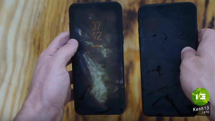 Tiếp tục đốt 2 smartphone này lần 2, màn hình iPhone 7 Plus tối đen hoàn toàn, trong khi Galaxy S8 Plus vẫn hiển thị được 1 vài thông tin ít ỏi.