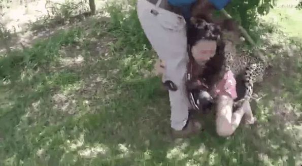 Các nhân viên của công viên đang đứng ngay gần đó thấy vậy liền nhanh chóng dùng roi đe doạ và gỡ con báo hung dữ ra khỏi người du khách, trước khi nó kịp gây ra những thương tích nguy hiểm cho cô.