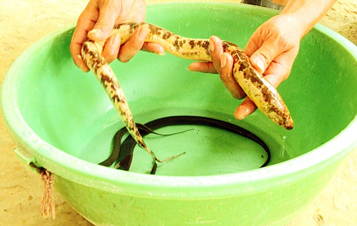 Con lươn có màu rất lạ và có cân nặng lên đến 400gram.Người bắt được con lươn sẽ làm tủ kính để có thể nuôi con lươn. Con lươn màu vàng được cho là rất hiếm.