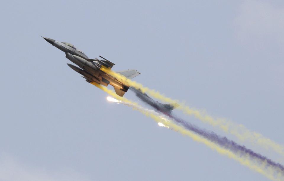 Máy bay phản lực RF-16 của Hàn Quốc bắn pháo sáng nhằm đánh lạc tên lửa diệt máy bay