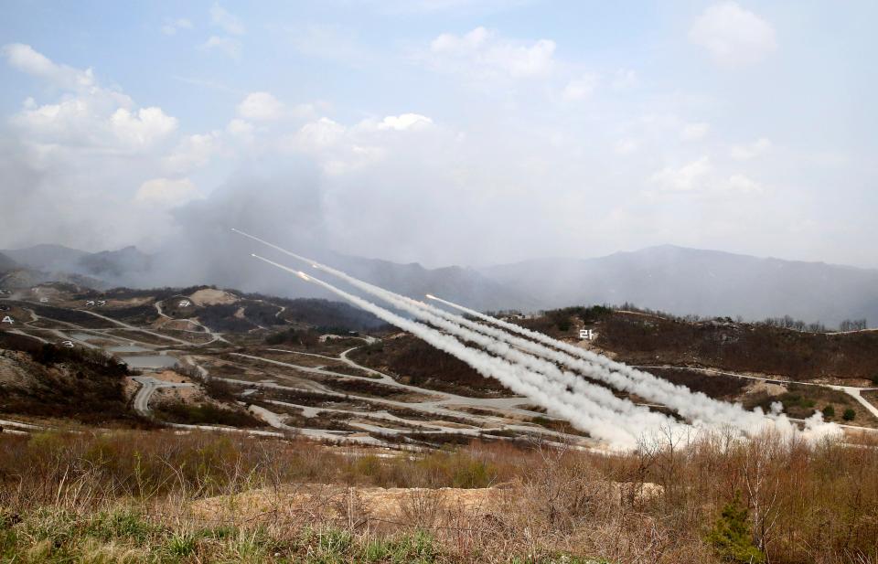 Trực thăng, binh lính, xe tăng và một loạt thiết bị hỏa lực khác đã thể hiện sức mạnh tàn phá như một sự chuẩn bị cho nguy cơ chiến tranh với lực lượng của Triều Tiên, theo The Sun.