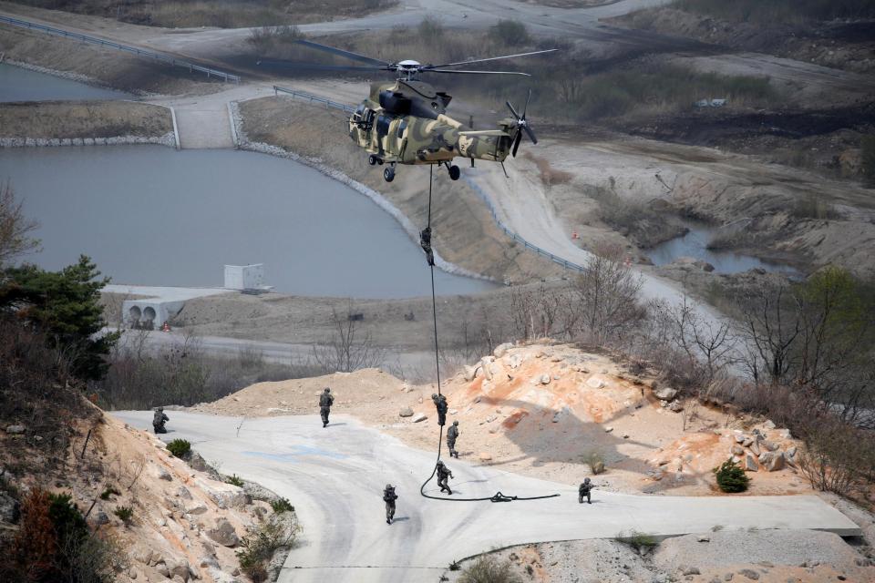 Lính Hàn Quốc đáp đất từ trực thăng trong cuộc diễn tập quân sự tốc độ nhanh