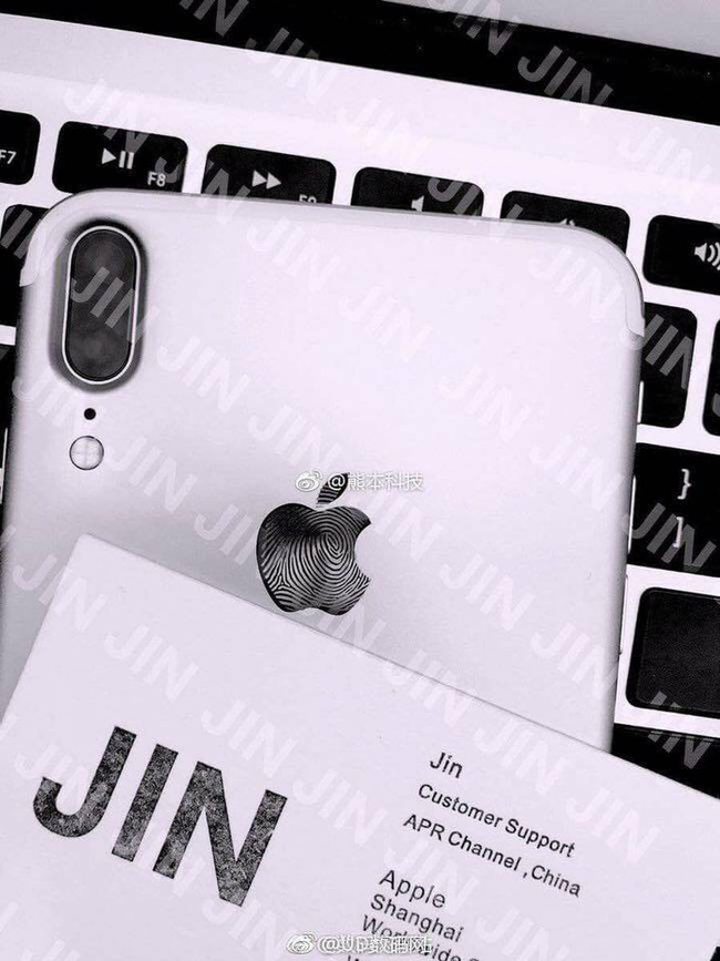 Ở viền trên, Apple vẫn tích hợp dải nhựa thu sóng màu bạc, tương tự như trên iPhone 7. Tuy nhiên, điểm đặc biệt nhất ở đây vẫn là logo hình quả táo đặc trưng của Apple được khắc thêm biểu tượng vân tay. Như vậy, rất có thể Apple đã tích hợp được bộ quét vân tay lên logo.