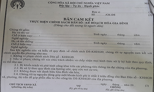 Trước thông báo nêu trên, anh Đạt đành chấp nhận đóng tiền và ký vào bản cam kết với nội dung: "Tự nguyện đóng một khoản phí ít nhất 2 triệu đồng cho ban dân số kế hoạch hoá, để góp phần đầu tư cho lĩnh vực này của địa phương".