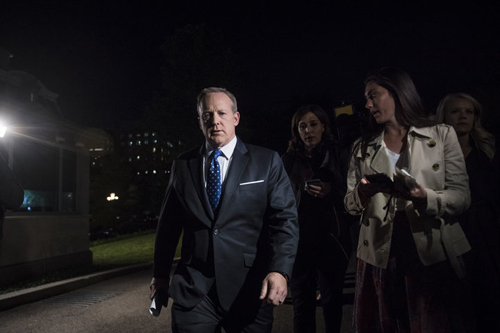 Ông Spicer vội vàng tìm cách trở về căn văn phòng, dù vây quanh là hàng loạt các phóng viên đặt câu hỏi tại sao Tổng thống Donald Trump bất ngờ sa thải Giám đốc FBI James Comey.