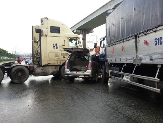Khi vừa qua khỏi cầu vượt trạm 2, bất ngờ gặp sự cố khiến thân xoay ngang đường, tông trúng hông ôtô 7 chỗ BKS 51A-906.35 đang lưu thông cùng chiều bên phải.