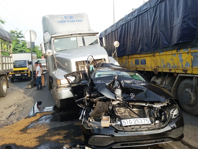 Khi đến trước trường Đại Học Nông Lâm, tài xế cho xe dừng đèn đỏ. Bất ngờ, chiếc xe container do một tài xế (khoảng 45 tuổi ) điều khiển mang BKS 51C-359.73 chạy cùng chiều húc mạnh vào đuôi ô tô Mercedes làm phương tiện này tiếp tục ủi về phía trước tông trúng xe đầu kéo mang BKS 61C-225.02 cũng đang dừng đèn đỏ phía trước.