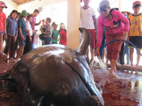Hôm nay 31/5, tại lăng Ông của thôn Long Thủy, xã An Phú, thành phố Tuy Hòa (tỉnh Phú Yên) ngư dân ở đây làm thủ tục chon cất cá voi cái đang mang thai nặng hơn 1 tấn lụy bờ.