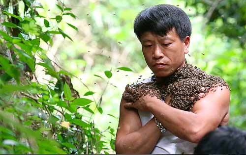 Anh Bùi Duy Nhất được mệnh danh là "dị nhân" Điện Biên. Anh có bí quyết thu phục ong rừng của riêng mình. Đàn ong vỡ tổ đậu khắp người anh Nhất đủ loạt từ ong đá, ong ruồi đến ong khoái.